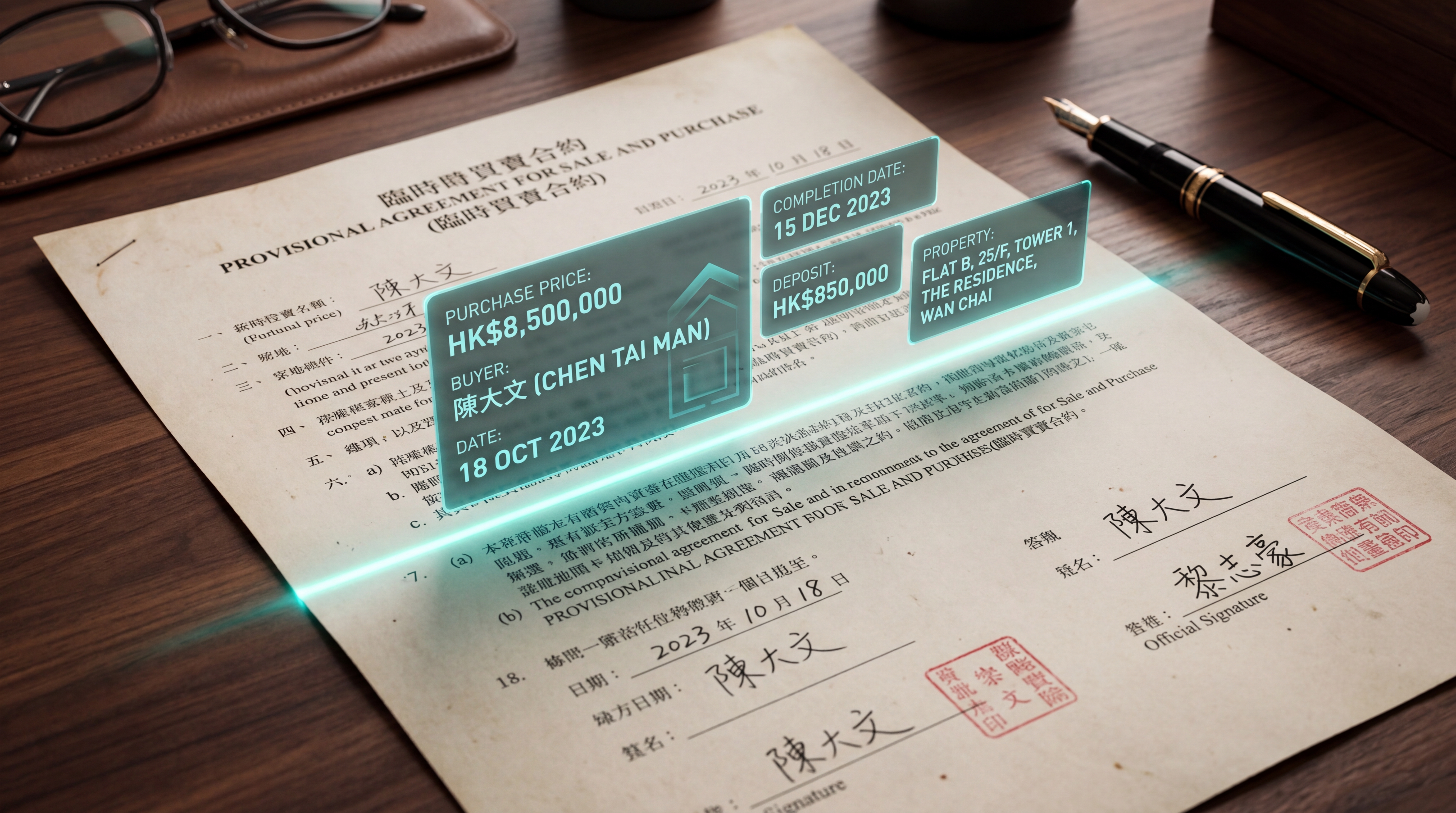 但到了 2026 年,大多数地产代理、银行和律师行的工作流程仍然是这样:在经纪行现场签署一份纸本 PASP,然后扫描或手机拍照,把 PDF 电邮给银行、律师和买方的会计师,接着由初级职员把所有字段逐一键入 CRM、按揭系统或案件管理工具,最后再由另一个人拿原件逐行核对。